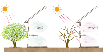 住まいの周りに植栽された落葉樹。葉が生い茂る夏は陽ざしを遮り、葉が枯れ落ちる冬はあたたかな陽ざしを室内に。日中の日照環境を調整する自然のカーテンが1 年を通して建物の断熱効果を図る役割を果たします。