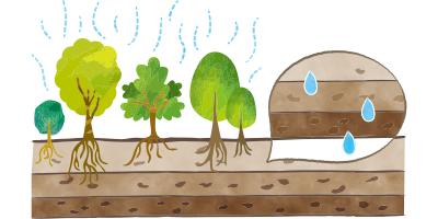 植物の蒸散と地中への雨の染み込みが夏の暑さを和らげる。自然から生まれた温度調節機能。地表に枯れ落ちた葉や枝が、やがて土を腐葉土化し、雨をゆっくりと染み込ませて地表の温度を緩和していきます。