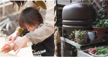 災害などの有事の際には、生活用水としても使える雨水タンクを全戸設置。普段は庭の草木の散水や打ち水に利用できます。万が一の時は、トイレなどの生活水への利用や、非常用の浄水ボトルを利用した飲み水への転換も可能。
